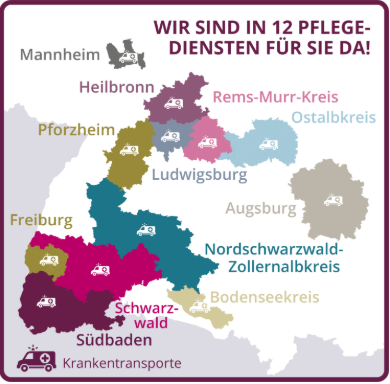 - wir betreiben unter der Marke Home Instead insgesamt zwölf Pflegedienste in Lörrach, Villingen-Schwenningen, Albstadt, Pforzheim, Mannheim, Ludwigsburg, Augsburg, Heilbronn, Rems-Murr-Kreis, Ostalbkreis, Freiburg und Friedrichshafen. Insgesamt versorgen wir mit über 1000 Mitarbeitenden täglich über 4000 Patienten/innen.