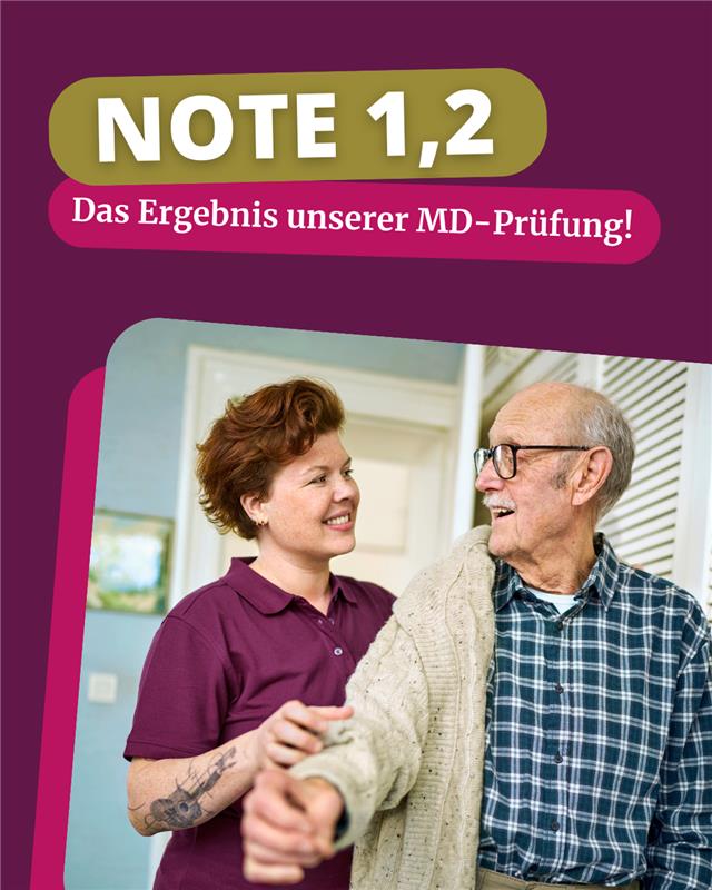 Home Instead Köln-Süd wurde bei der aktuellen MD-Prüfung mit der Note 1,2 bewertet. Das Ergebnis bestätigt unsere hohe Betreuungsqualität und verlässliche Arbeitsweise.