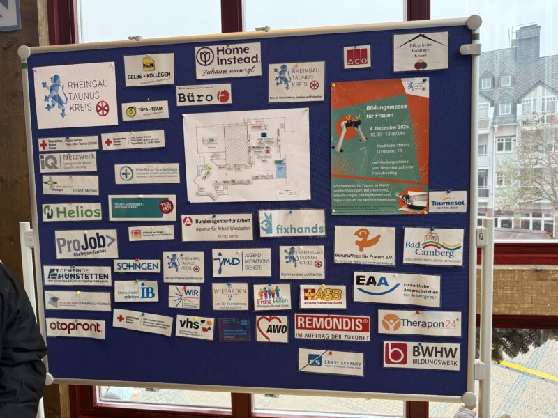 Am 4. Dezember öffnete die Stadthalle Idstein erneut ihre Türen für die erfolgreiche Bildungsmesse für Frauen des Rheingau-Taunus-Kreises. Die Veranstaltung richtet sich gezielt an Frauen, die den (Wieder-)Einstieg in den Arbeitsmarkt planen oder sich beruflich neu orientieren möchten. Organisiert wurde die Messe von der Gleichstellungsbeauftragten des Rheingau-Taunus-Kreises und der Beauftragten für Chancengleichheit am Arbeitsmarkt des Kommunalen JobCenters.
